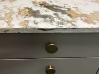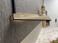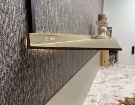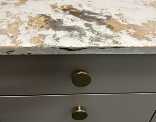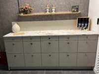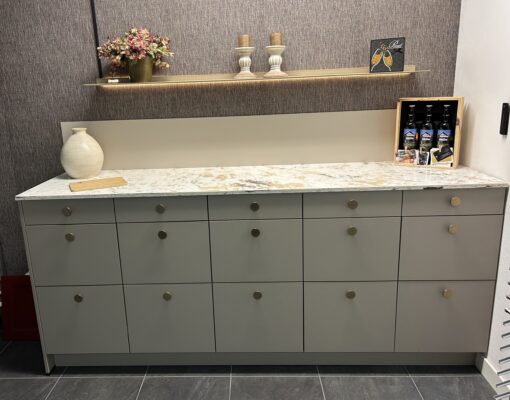Buffet meubel van Cityline model PARIJS in de kleur klei met goudkleurige knop 679. Het unieke blad van Cosmostone kleur Blanco Vintage glans. Rugwand in de kleur YAZD van Bokmerk en een Strackk verlichting plank RAL kleur 1019.